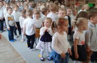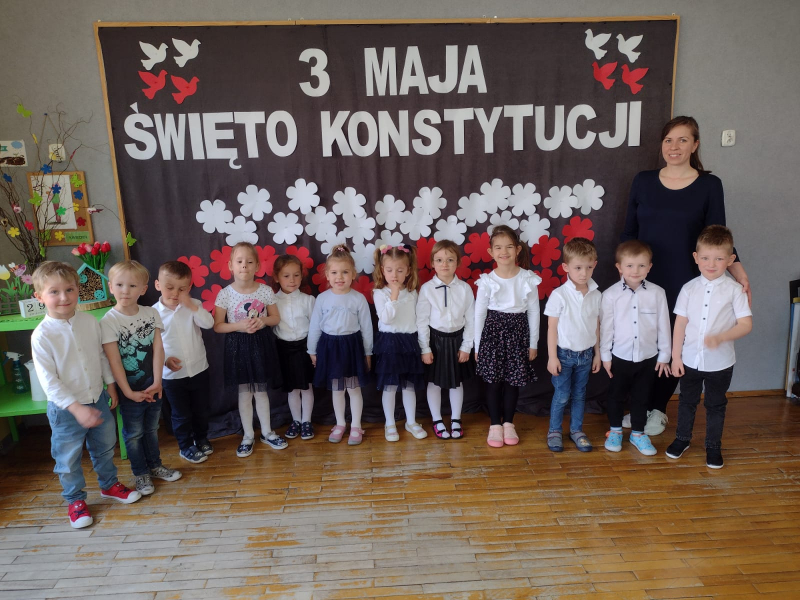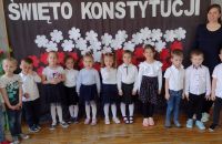 W ostatni piątek przed zbliżająym się długim weekendem majowym dzieci z młodszych grup w oddziałach w P2 zebrały się na wspólnym apelu, podczas którego - ubrane na galowo, wysłuchały wiersza nawiązującego do Święta Konstytucji, a następnie odśpiewały hymn.