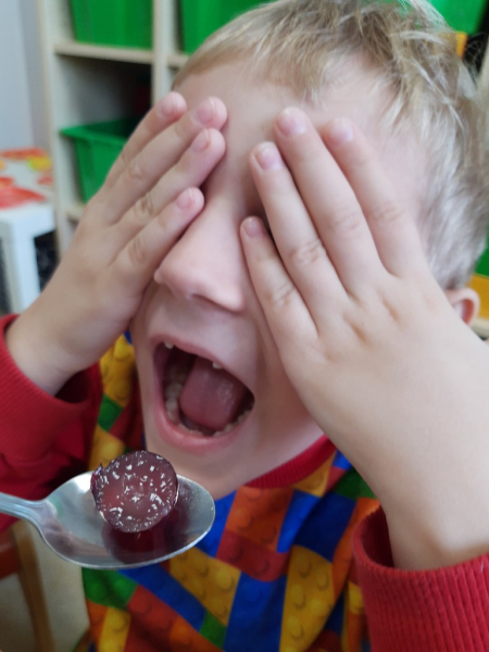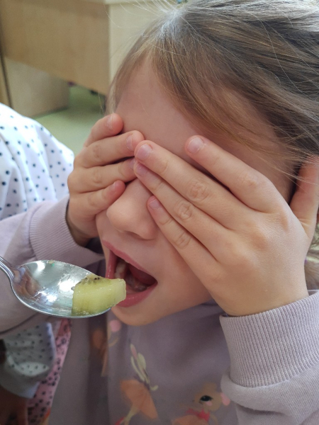 W ramach projektu, dzieci z grupy „Żabki” poznały, jak ważną rolę w naszym życiu, odgrywa odpowiednia skomponowana dieta. Poznaliśmy wybrane rodzaje warzyw i owoców. Nieodzownym elementem naszych zajęć były zabawy sensoryczne, plastyczne, a także własne doświadczenia. Dzieci miały okazję zamienić się w kucharzy: skomponować zdrową kanapkę oraz przygotować sałatkę owocową.