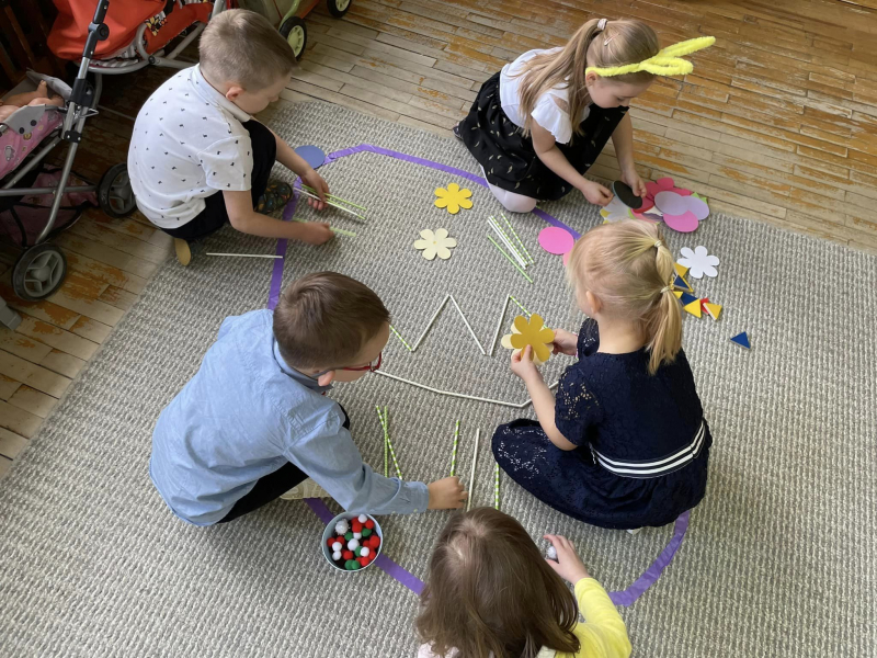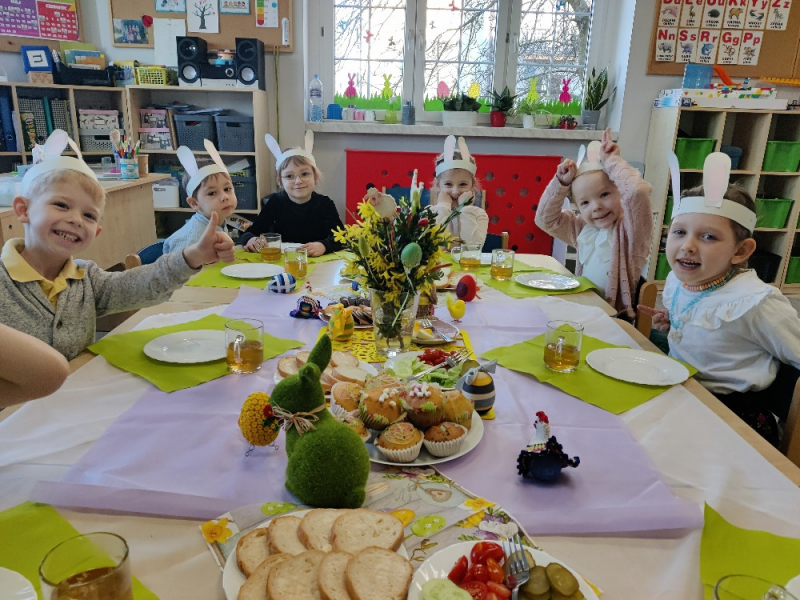 Wielkanoc w przedszkolu minęła nam na wielu zabawach i aktywnościach związanych ze zbliżającymi się świętami. Było śniadanie, życzenia, poszukiwanie zajączka oraz wspólna giga pisanka, cały dzień upłynął nam w bardzo świątecznym nastroju.
