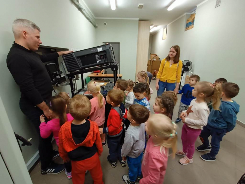 Grupy "Tęczowe Ludki" oraz "Gromadka Puchatka" omawiając tematykę związaną ze sztuką zostały zaproszone w tym tygodniu na zwiedzanie Centrum Kultury "Karolinka". Dzieci miały okazję zapoznać się z pracą wykonywaną przez różne osoby pracujące w takim obiekcie: odwiedziliśmy pokój akustyka, poznaliśmy również "świetlika", czyli osobę odpowiedzialną za oświetlenie podczas występów na scenie. Przedszkolacy odwiedzili również garderobę, w której przechowuje się stroje ludowe oraz elementy dekoracji wykorzystywanej przy okazji różnorakich koncertów. Dzieci weszły na moment na scenę i mogły obejrzeć jak wygląda ekran kinowy z drugiej strony. Następnie grupy mogły przyjrzeć się pomieszczeniom, w których aktorzy lub tancerze przygotowują się do występu oraz gdzie odbywają się zajęcia dla dzieci. Na samym końcu zwiedziliśmy pomieszczenie, w którym znajduje się projektor filmowy. To była bardzo udana wycieczka!