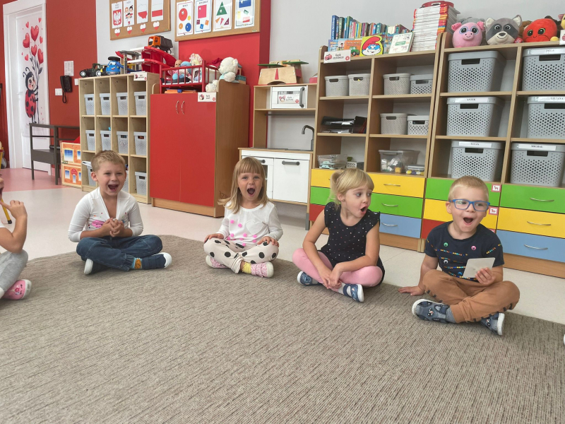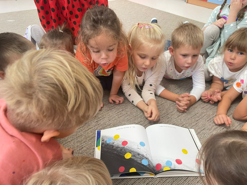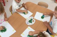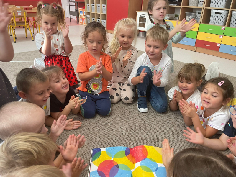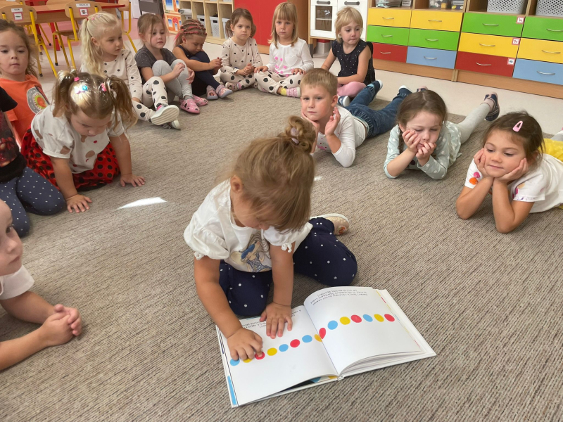 W naszej grupie świętowanie tego wyjątkowego dnia rozpoczęliśmy od aktywnego czytania książki pt.: "Naciśnij mnie", dzieci podczas zapoznawania się z lekturą miały okazję naciskać i dmuchać w kropki, potrząsać i obracać książkę. Następnie przeszliśmy do pozostałych zabaw z kropkami w roli głównej: