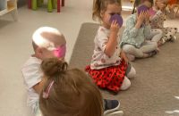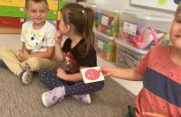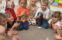 - "Podaj kropkę" - zabawa muzyczno-ruchowa rozwijająca orientację w schemacie własnego ciała.