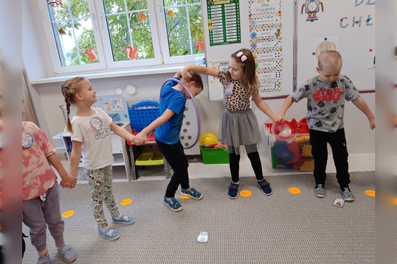 -oraz ćwiczyły współpracę, m.in. podczas zabawy z przekazywaniem hula-hoopu.