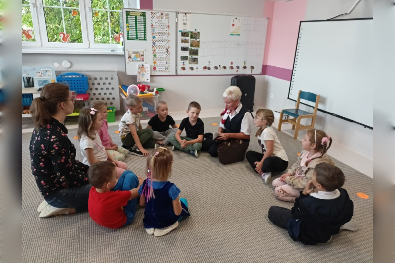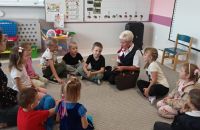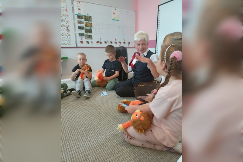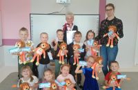 Nie zabrakło też wyjątkowego gościa! Bartek zaprosił do przedszkola swoją babcię Grażynkę, która pracuje na lotnisku w Pyrzowicach. Babcia w ciekawy sposób opowiedziała nam o swojej pracy, o tym, jak wyglądają przygotowania do lotów i jak odbywają się podróże samolotem. Każde dziecko otrzymało bilet na samolot oraz pamiątkowego pluszaka, a nasz Bohater Tygodnia – Bartek – został uhonorowany medalem i dyplomem.