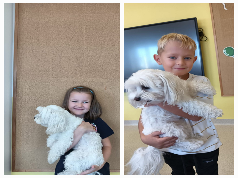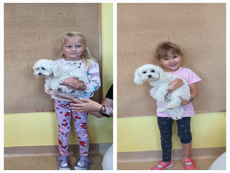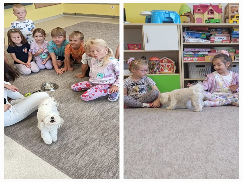 W kolejnym dniu odwiedziła nas Perełka – wesoły piesek. Przedszkolaki zobaczyły, jak wygląda opieka nad czworonogiem, poznały jego zwyczaje i potrzeby. Był czas na zabawę, głaskanie i rozmowy o tym, jak ważne jest odpowiedzialne traktowanie zwierząt.
