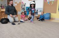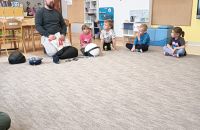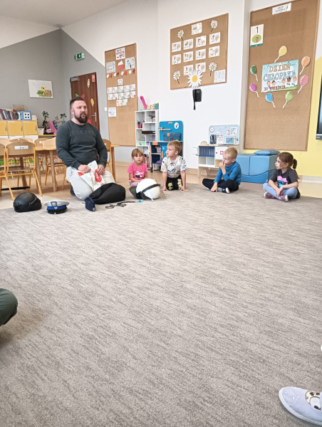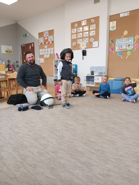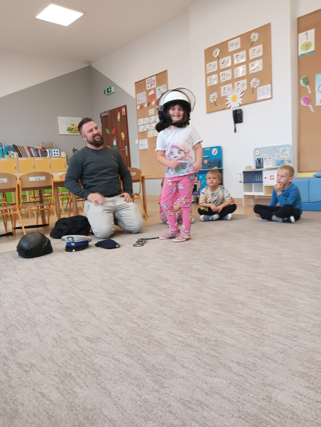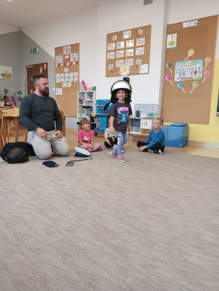 Nie zabrakło też wyjątkowego gościa! Julkę odwiedził jej tata, który pracuje jako policjant. Opowiedział dzieciom o swojej pracy, pokazał elementy stroju policyjnego oraz różne akcesoria, których używa podczas służby. Dzieci z dużym zaciekawieniem słuchały opowieści o codziennych zadaniach policjanta.