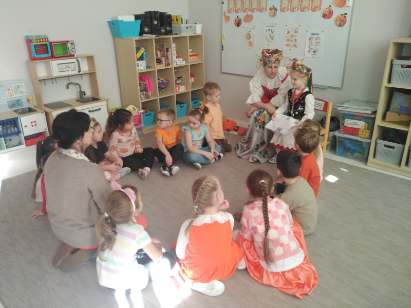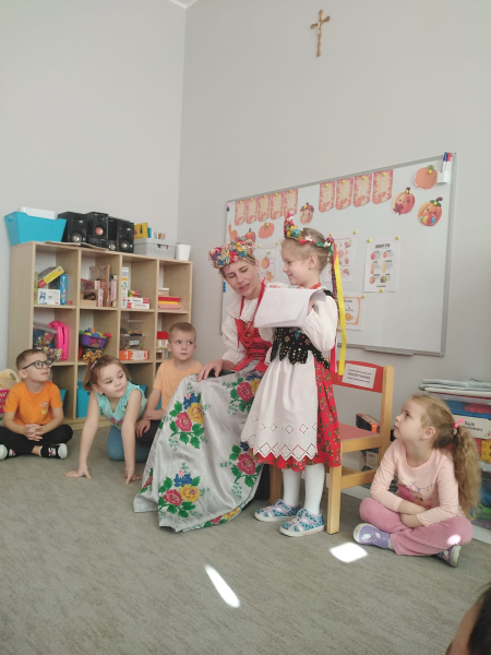 Dzisiaj gościliśmy dwie piękne Panie tzn. mamę naszej Bohaterki Tygodnia i samą Judytę w przepięknych strojach ludowych: śląskim i krakowskim. Nasza Bohaterka to urodzona tancerka, wraz z siostrami i mamą tańczą lub tańczyły w zespołach "Śląsk" i "Mały Śląsk". Dowiedzieliśmy się również więcej o naszej koleżance - ulubionyc kolor, marzenie i kim chciałaby zostać w przyszłości. Na zakończenie spotkania dzieci zrobiły piękne ala-śląskie wianki. Bardzo dziękujemy za miłe spotkanie.