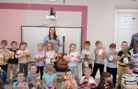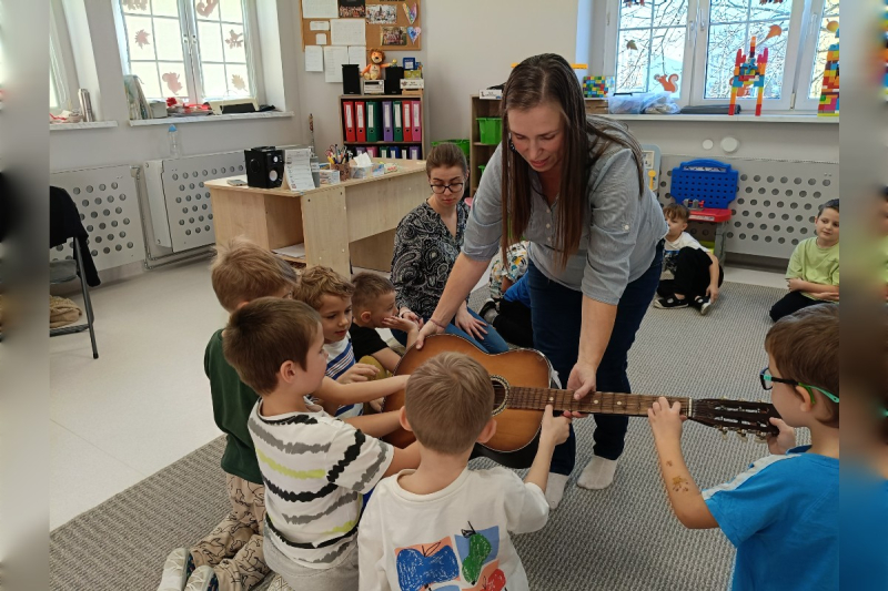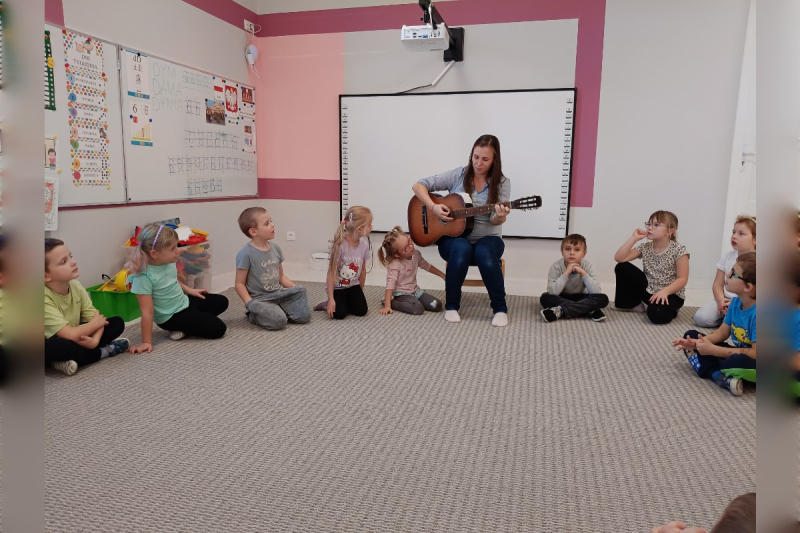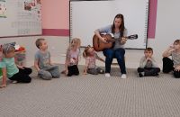 Wyjątkowym momentem tygodnia była wizyta mamy Ewy – Pani Aleksandry. Nasz gość przyniósł gitarę i zaprezentował jej brzmienie, a następnie zagrał kilka piosenek, które śpiewaliśmy razem. Dzieci były zachwycone wspólnym muzykowaniem. Pani Aleksandra opowiedziała także o ciąży oraz o tym, jak należy opiekować się niemowlętami. Przedszkolaki miały okazję nauczyć się, jak prawidłowo zakładać pampersy na pluszowych zabawkach – było przy tym wiele śmiechu i zaangażowania.
