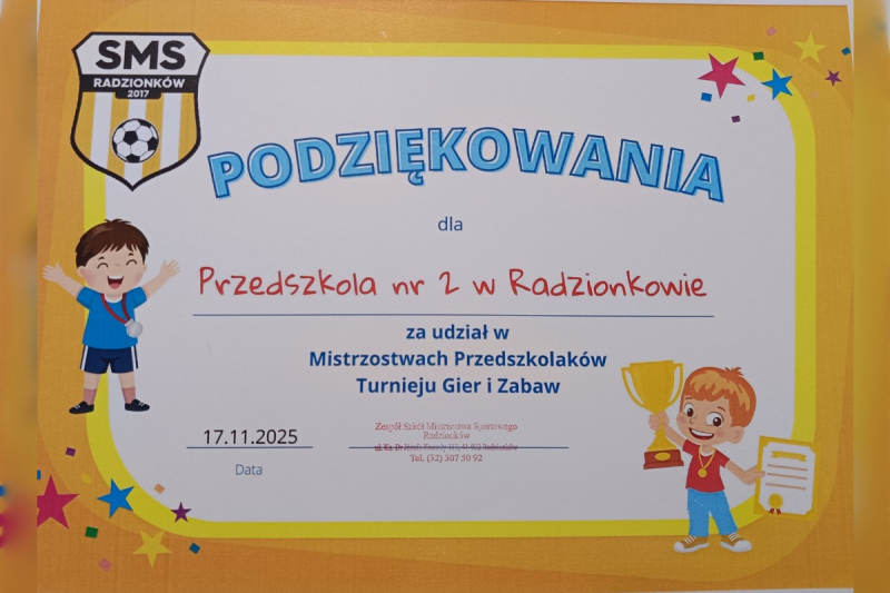 17 listopada ośmioro dzieci z grupy Skowronki oraz dwoje dzieci z grupy Mrówki wzięło udział w III Mistrzostwach Przedszkolaków – Turnieju Gier i Zabaw, organizowanych przez SMS na hali MOSiR w Radzionkowie.