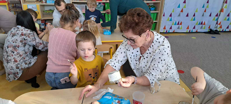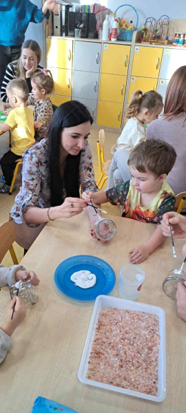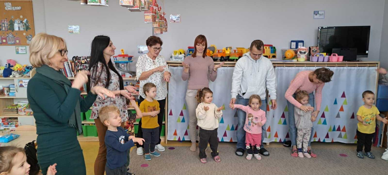 Celem zajęć było przybliżenie dzieciom tradycji świątecznych oraz wspieranie ich rozwoju poprzez różnorodne aktywności. Dzieci układały czteroelementowe puzzle przedstawiające elementy związane z wieczerzą wigilijną, rozwijając spostrzegawczość i logiczne myślenie. Wspólne śpiewanie piosenki o Mikołaju z pokazywaniem sprzyjało integracji dzieci i rodziców oraz rozwijaniu koordynacji ruchowej. Dzieci wysłuchały informacji dotyczących kształtów pierników, ćwicząc koncentrację i uważne słuchanie, a następnie udekorowały wspólną choinkę, ucząc się współpracy. Świąteczne rozkodowywanie drogi według mapy wspierało orientację przestrzenną i myślenie przyczynowo-skutkowe. Na zakończenie dzieci wykonały świąteczne świeczniki, rozwijając sprawność manualną, kreatywność oraz poczucie estetyki.