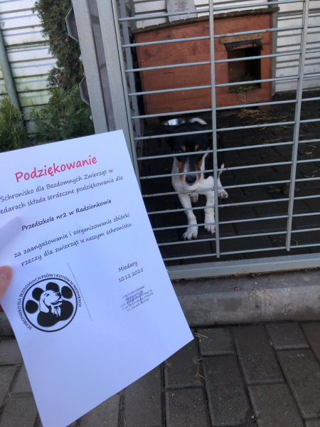 W naszym przedszkolu została przeprowadzona zbiórka darów dla schroniska dla zwierząt w Miedarach. Dzięki ogromnemu zaangażowaniu dzieci i rodziców udało się zgromadzić karmę, koce i niezbędne akcesoria, które z pewnością pomogą podopiecznym schroniska.