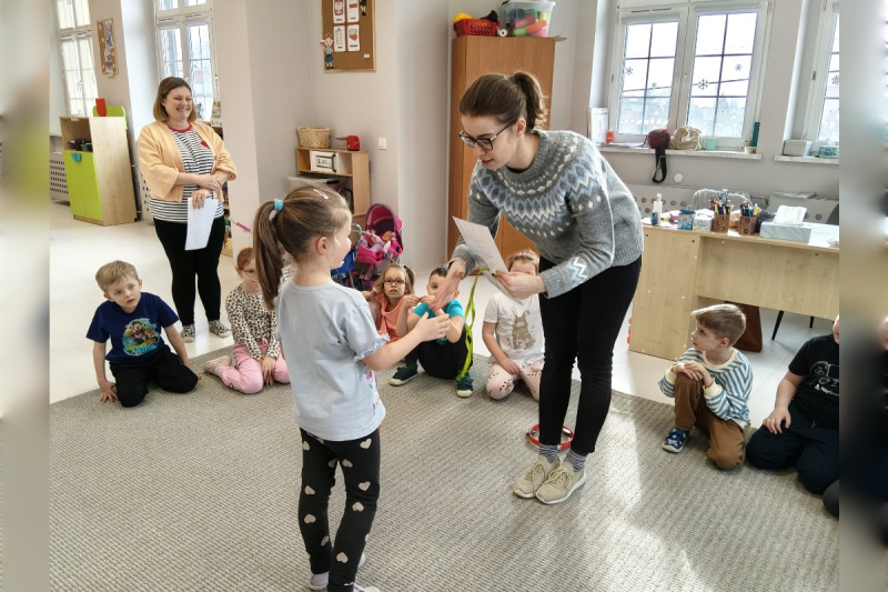 Szczególnym wydarzeniem była wizyta mamy Antosi – Pani Patrycji, która opowiedziała dzieciom o swojej pracy, przybliżając im, na czym polega praca kadrowej. Przygotowała także dla przedszkolaków ciekawe aktywności: łamigłówkę w formie labiryntu, kolorowanki oraz słodką niespodziankę, która sprawiła dzieciom wiele radości.