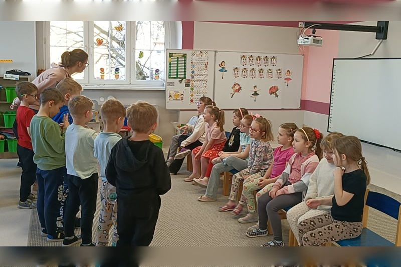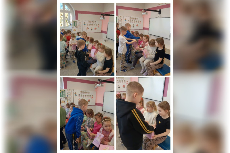 Chłopcy przygotowali dla swoich koleżanek niespodziankę – wspólnie zaśpiewali im gromkie „Sto lat”, składając serdeczne życzenia. Następnie wręczyli dziewczynkom małe upominki, które sprawiły im wiele radości i wywołały uśmiechy na twarzach.