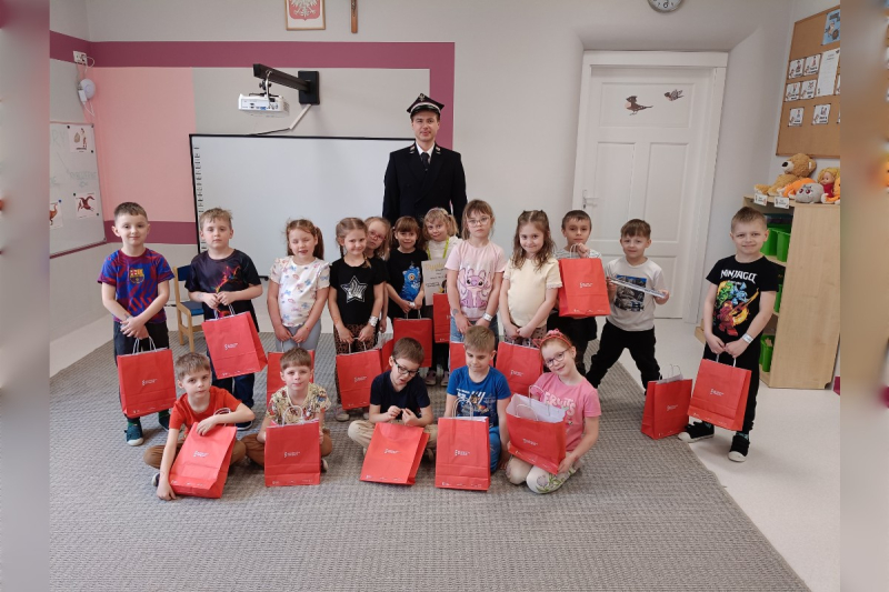 Na zakończenie spotkania dzieci otrzymały upominki – odblaski, książeczki edukacyjne oraz kolejowe gadżety sponsorowane przez koleje.