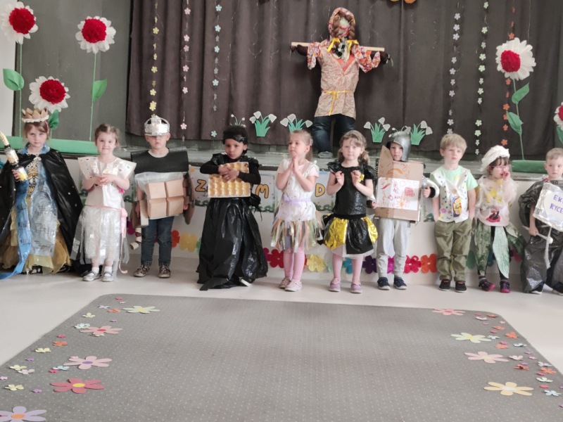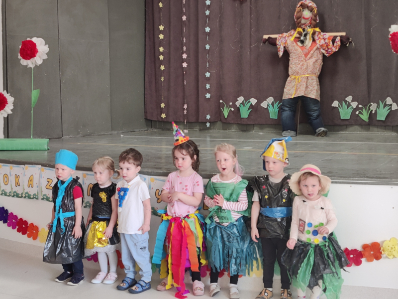W dniu dzisiejszym świętowaliśmy Pierwszy Dzień Wiosny w wyjątkowo kreatywny sposób. Dzieci wzięły udział w eko‑pokazie, podczas którego zaprezentowały niezwykle pomysłowe stroje wykonane z surowców wtórnych. Na wybiegu pojawiły się m.in. . suknie z gazet, kosmiczne kombinezony, peleryny z worków na śmieci, stroje robotów i rycerzy z kartonów, dodatki z nakrętek i rolek po papierze oraz wiele innych fantastycznych kreacji.