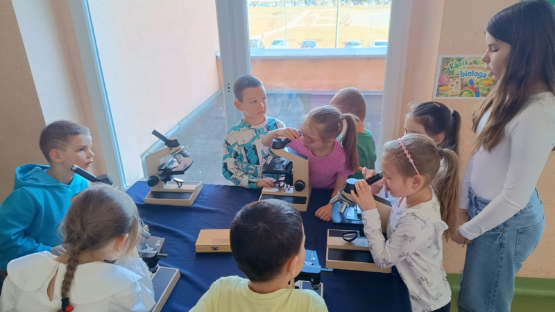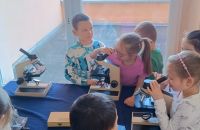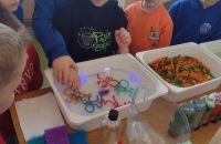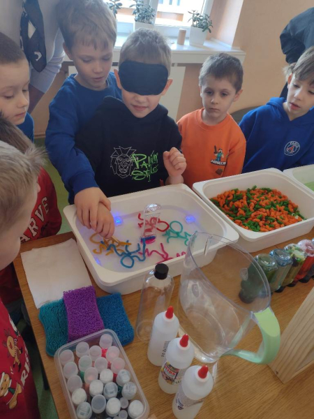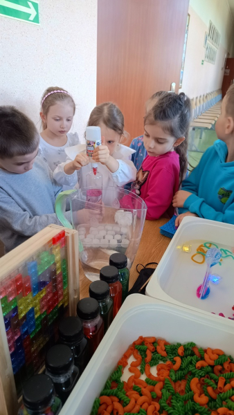 Na naszych przedszkolaków czekało również wiele ciekawych atrakcji. Dzieci z radością pokonywały tor przeszkód, tworzyły butelki sensoryczne, robiły pamiątkowe zdjęcia z maskami i różnymi rekwizytami, a także mogły poczuć się jak mali naukowcy, oglądając różne substancje pod mikroskopem.