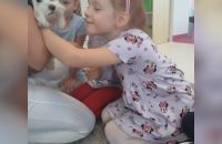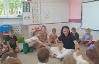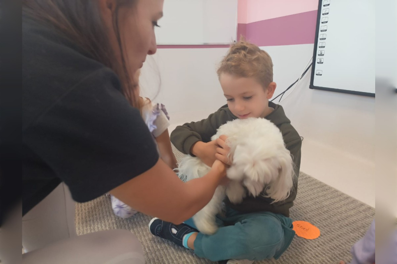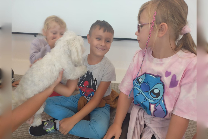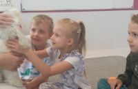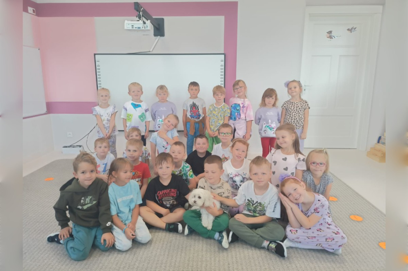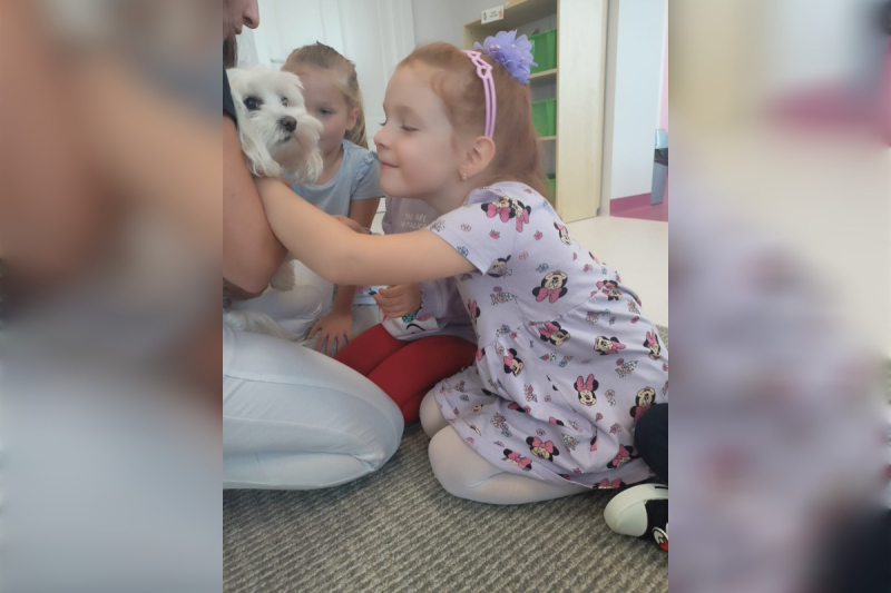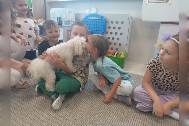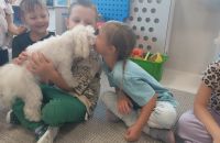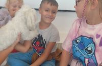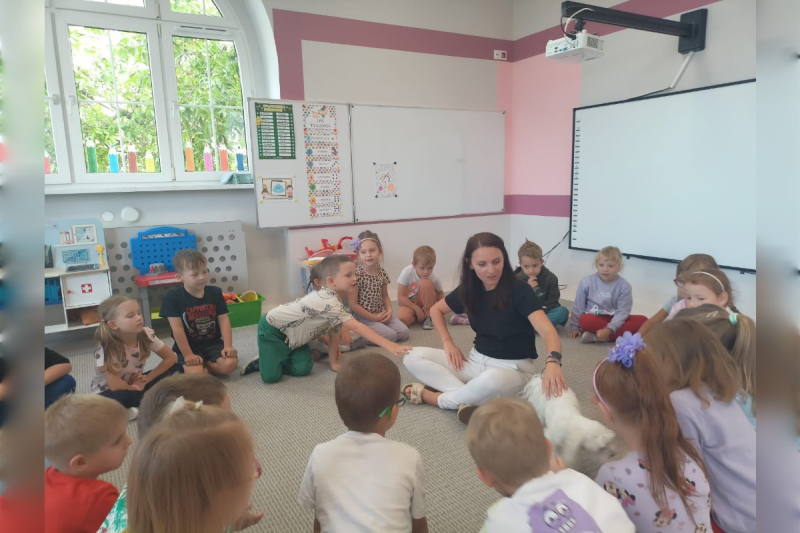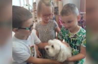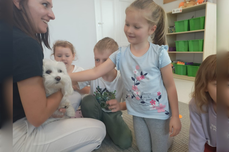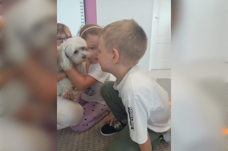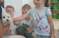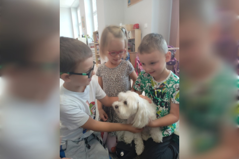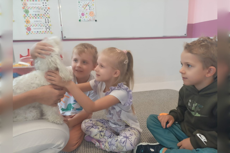 Największą atrakcją była wizyta wyjątkowego gościa – psa Perełki, który należy do babci Bartka. Dzięki obecności Perełki dzieci mogły z bliska zobaczyć, jak wygląda opieka nad czworonożnym przyjacielem: jak go głaskać, czesać, karmić oraz w jaki sposób zapewnić mu ruch i zabawę. Spotkanie sprawiło wszystkim mnóstwo radości i pomogło lepiej zrozumieć, że posiadanie zwierzątka to także odpowiedzialność.