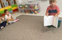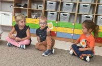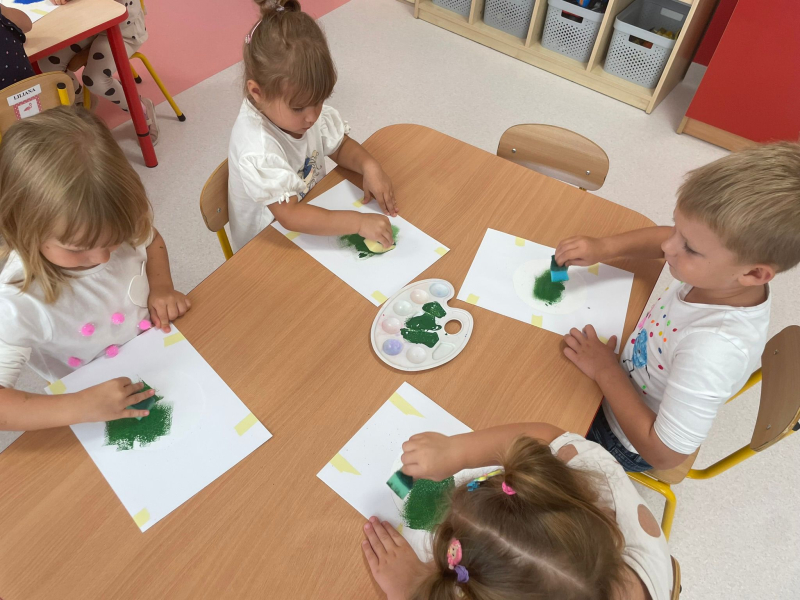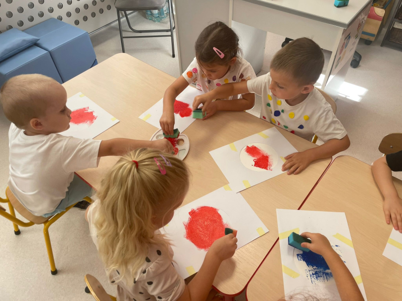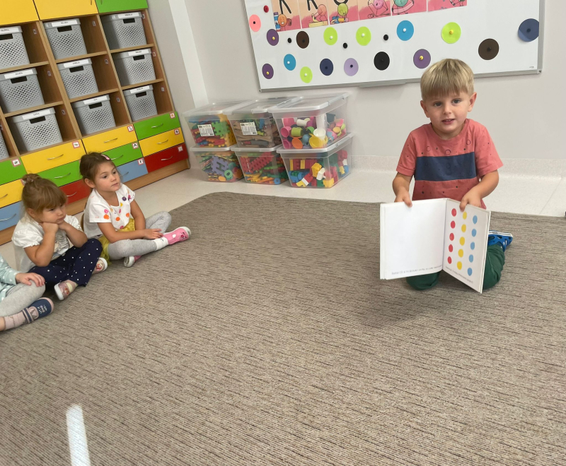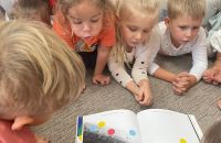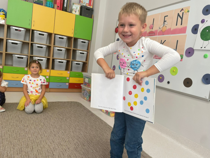 W naszej grupie świętowanie tego wyjątkowego dnia rozpoczęliśmy od aktywnego czytania książki pt.: "Naciśnij mnie", dzieci podczas zapoznawania się z lekturą miały okazję naciskać i dmuchać w kropki, potrząsać i obracać książkę. Następnie przeszliśmy do pozostałych zabaw z kropkami w roli głównej: