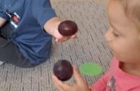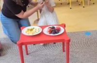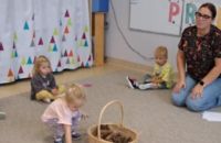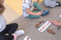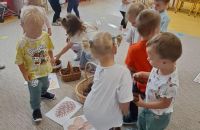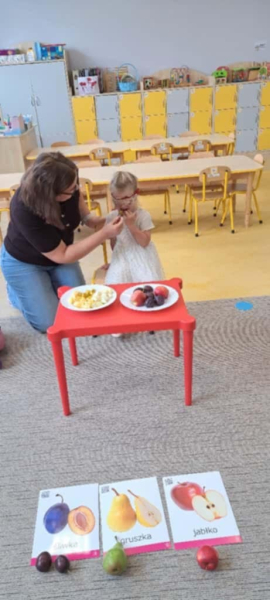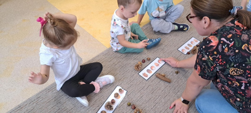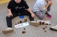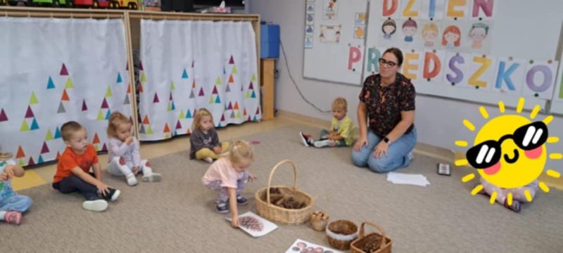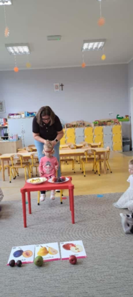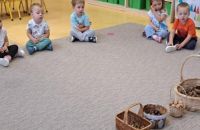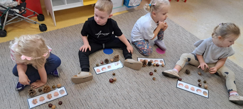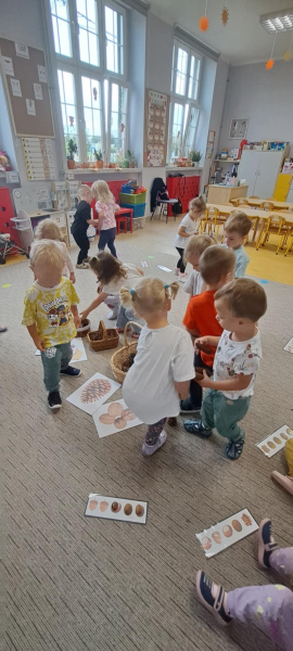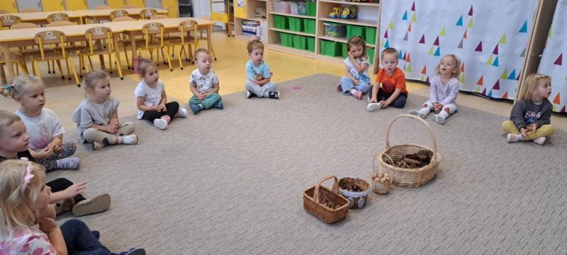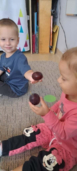 Dzieci segregowały dary jesieni (szyszki, żołędzie, kasztany, orzechy), układały wg wzoru. Miały również okazję podczas zajęć posmakować sezonowych owoców, rosnących w sadzie ( jabłka, gruszki oraz śliwki). TO BYŁY BARDZO SMAKOWITE ZAJĘCIA.