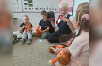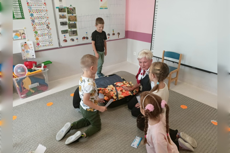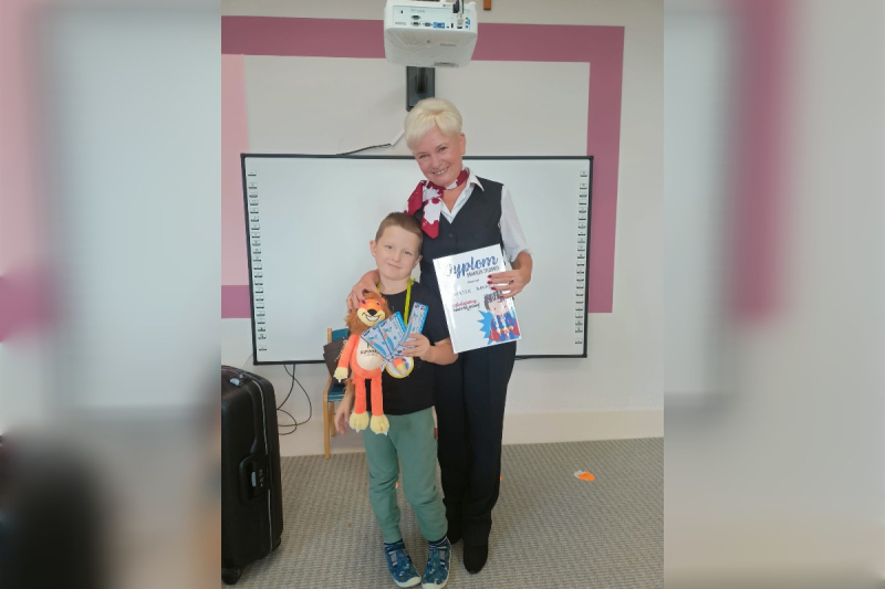 Nie zabrakło też wyjątkowego gościa! Bartek zaprosił do przedszkola swoją babcię Grażynkę, która pracuje na lotnisku w Pyrzowicach. Babcia w ciekawy sposób opowiedziała nam o swojej pracy, o tym, jak wyglądają przygotowania do lotów i jak odbywają się podróże samolotem. Każde dziecko otrzymało bilet na samolot oraz pamiątkowego pluszaka, a nasz Bohater Tygodnia – Bartek – został uhonorowany medalem i dyplomem.