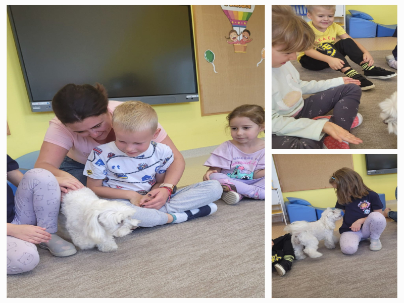 W kolejnym dniu odwiedziła nas Perełka – wesoły piesek. Przedszkolaki zobaczyły, jak wygląda opieka nad czworonogiem, poznały jego zwyczaje i potrzeby. Był czas na zabawę, głaskanie i rozmowy o tym, jak ważne jest odpowiedzialne traktowanie zwierząt.