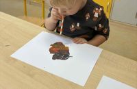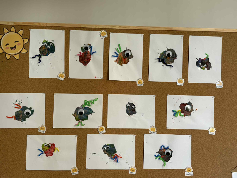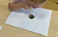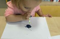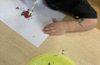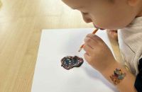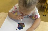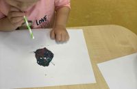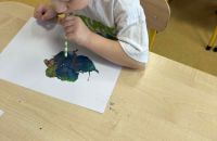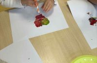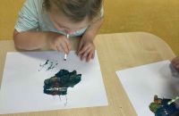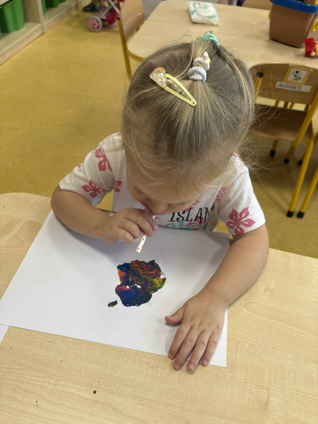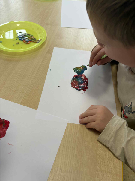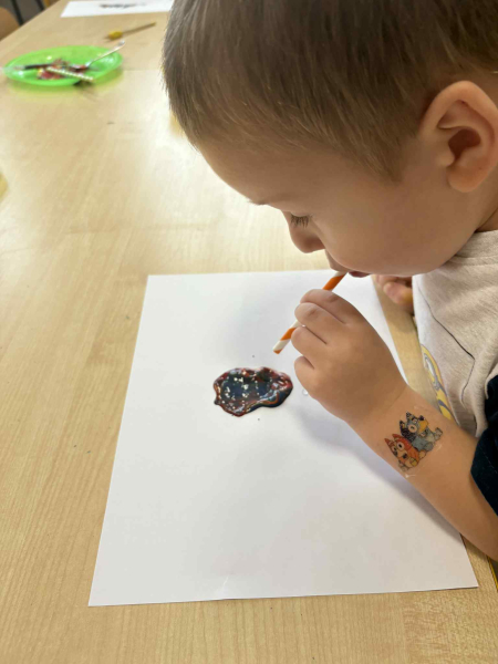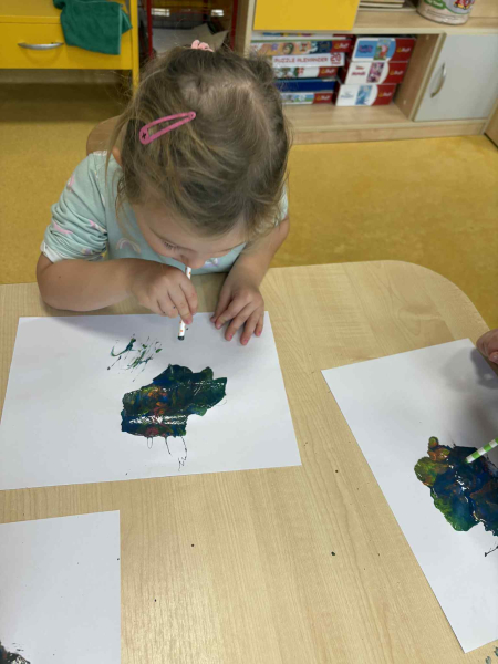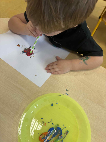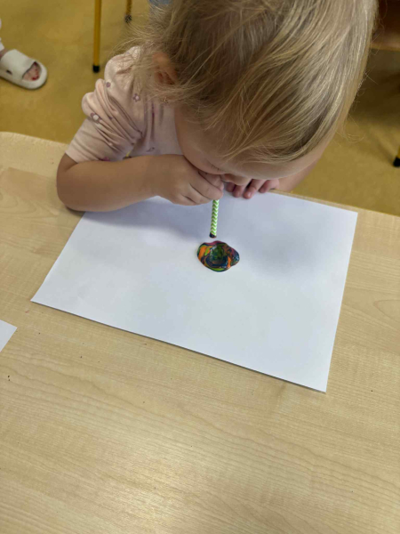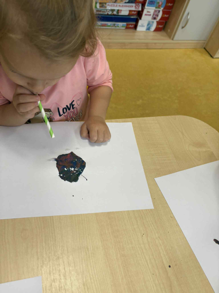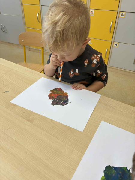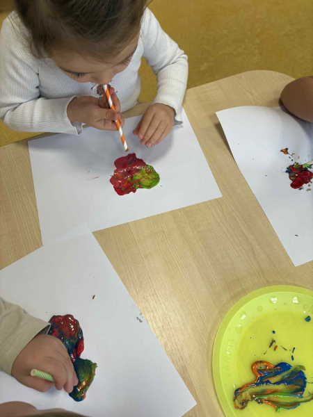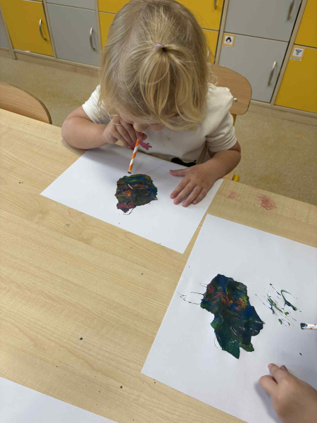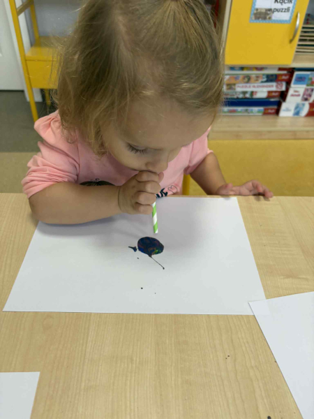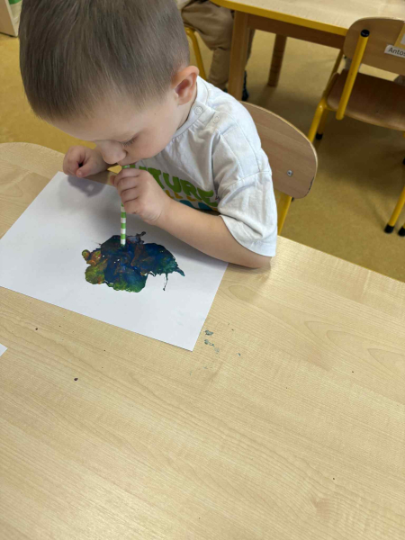 Dmuchając przez słomki tworzyły kolorowe wzory na kartkach, rozwijając przy tym oddech i koordynarcję. Zabawa sprawila przy tym dzieciom wiele radości a przy okazji powstały piękne, barwne prace plastyczne, które ozdobiły naszą przedszkolną szatnię