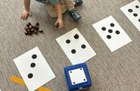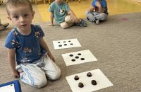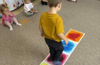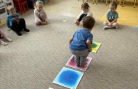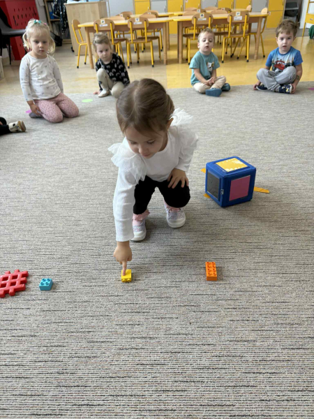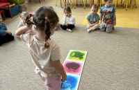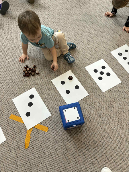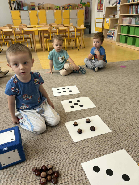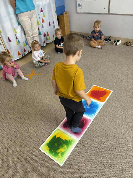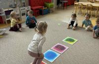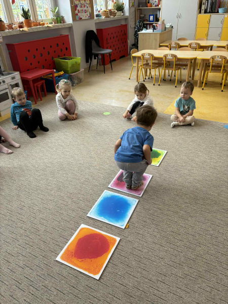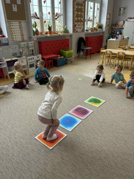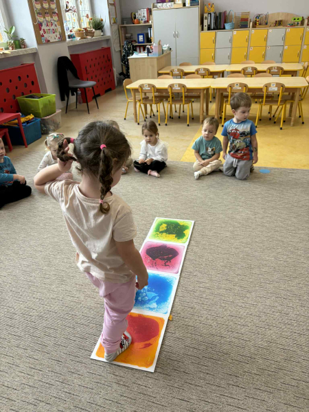 Podczas zajęć dzieci utrwalały nazwy kolorów oraz uczyły się przeliczać kasztany, rozwijając spostrzegawczość i umiejętności matematyczne . Następnie uczestniczyły w ćwiczeniach ruchowych z wykorzystaniem płynnych sensorycznych mat, które wspierały koordynację, równowagę i integrację zmysłową.