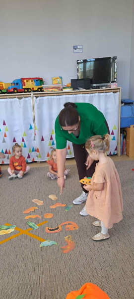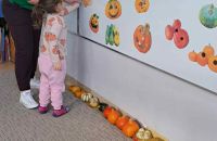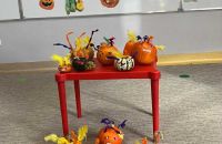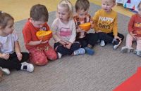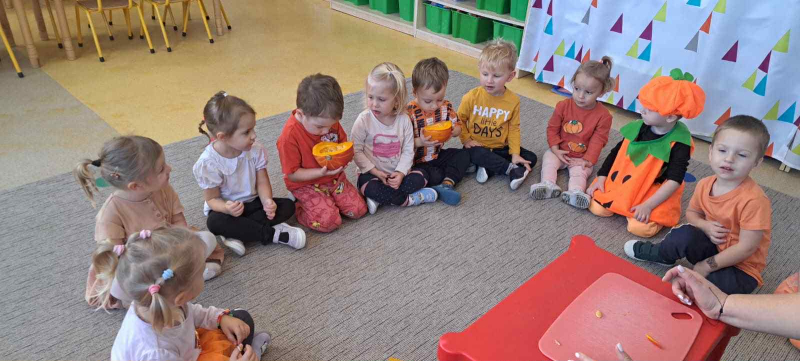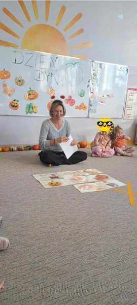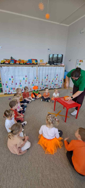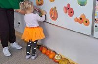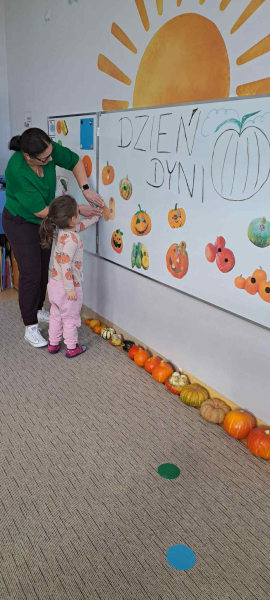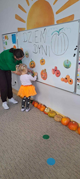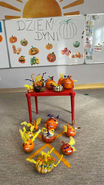 Dnia 31 października w naszym przedszkolu obchodziliśmy "Dzień Dyni". W tym dniu, symbolicznie dominował kolor pomarańczowy. Na zajęciach edukacyjnych o dyni, przedszkolaki dowiedziały się jak wygląda dynia, co zawiera w środku, z jakich nasion rośnie oraz jakie potrawy można przygotować z wykorzystaniem dyni. Były również zabawy dyniowe oparte na muzyce i ruchu m.in.: "Wędrująca dynia", "Podaj dynię". Dodatkowo , przedszkolaki rozwijały kompetencje matematyczne, dzieci kształtowały umiejętność klasyfikowania dyń wg wielkości i koloru , określania ile jest dyń (mało, dużo), przeliczania dyń , posługując się liczebnikami głównymi. Tego dnia dzieci również przyniosły ze sobą dynię do przedszkola, którą udekorowały na zajęciach wg swojej kreatywności i pomysłowości. Dynie zamieniły się w prawdziwe arcydzieła, które można oglądać na przedszkolnej wystawie w szatni.