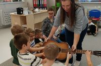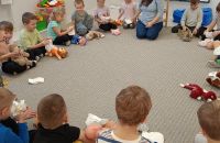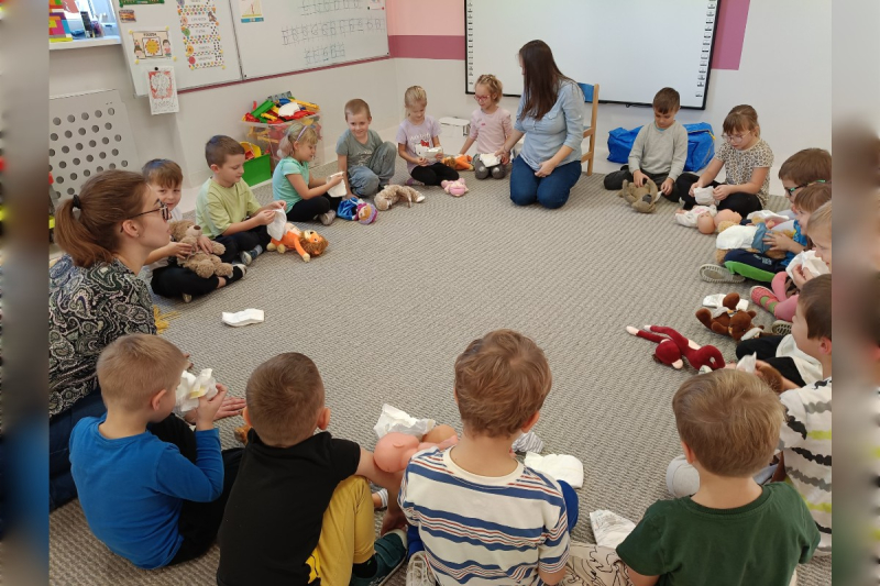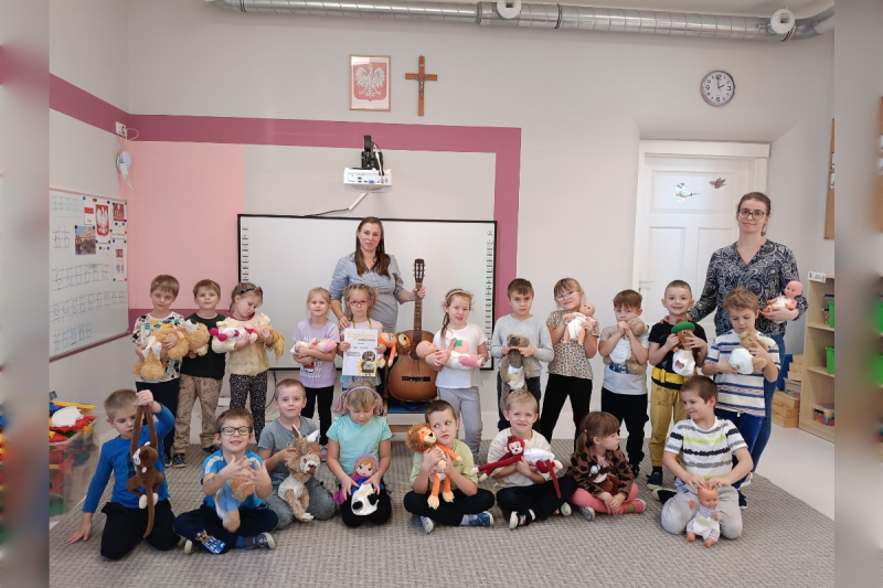 Wyjątkowym momentem tygodnia była wizyta mamy Ewy – Pani Aleksandry. Nasz gość przyniósł gitarę i zaprezentował jej brzmienie, a następnie zagrał kilka piosenek, które śpiewaliśmy razem. Dzieci były zachwycone wspólnym muzykowaniem. Pani Aleksandra opowiedziała także o ciąży oraz o tym, jak należy opiekować się niemowlętami. Przedszkolaki miały okazję nauczyć się, jak prawidłowo zakładać pampersy na pluszowych zabawkach – było przy tym wiele śmiechu i zaangażowania.