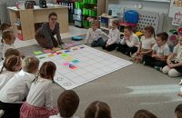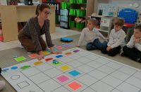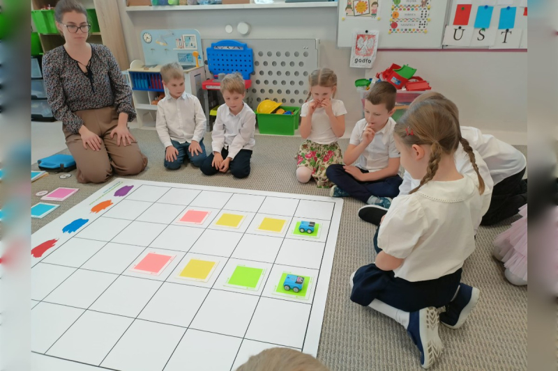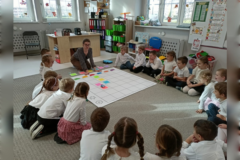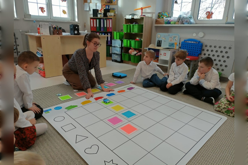 Dzieci odkryły również, że Indii porusza się po kolorowych płytkach i wykonuje polecenia przypisane do konkretnych kolorów. Wspólnie układaliśmy dla niego trasę, a następnie zorganizowaliśmy emocjonujące wyścigi dwóch robotów. Każda grupa mogła sprawdzić, która trasa okaże się szybsza i czy roboty wykonają zadania zgodnie z planem.