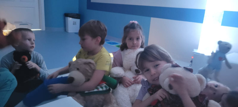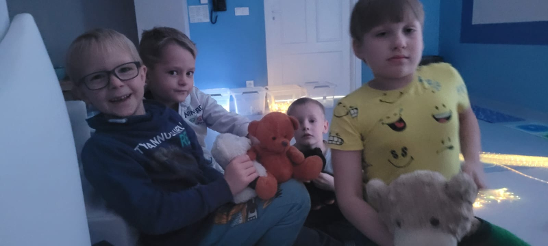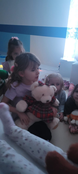 W grupie Stokrotek obchodziliśmy dziś Dzień Pluszowego Misia. Towarzyszyły nam praktykantki z liceum ogólnokształcącego, które obserwowały przebieg zajęć. Dzieci pomagały „wyleczyć” chorego misia, ćwicząc przy tym umiejętności matematyczne. Poznały także bajkę o Złotowłosej i trzech misiach, a podczas części sensorycznej z zaangażowaniem szukały niedźwiedzich łapek ukrytych w hydrożelowych kuleczkach. Na zakończenie przenieśliśmy się do ulubionej sali „Zajączków”, gdzie odbyła się relaksacja przy czytanej przez nauczyciela bajce.