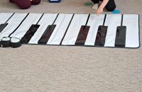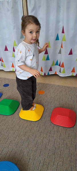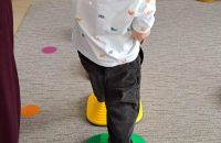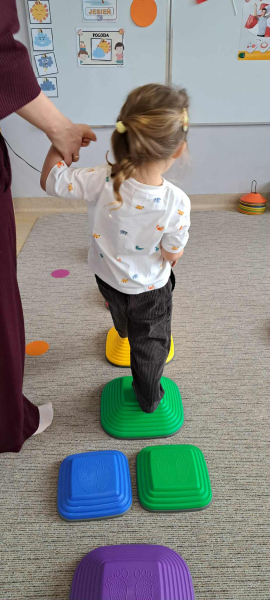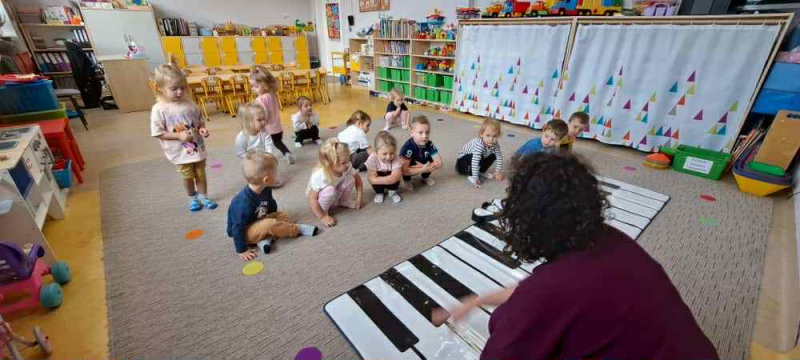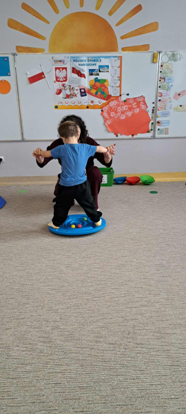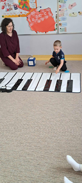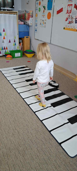 W grupie Słoneczka odbyły się zajęcia, podczas których dzieci rozwijały umiejętność utrzymywania równowagi, ćwicząc na desce do balansowania oraz pokonując różnorodny tor przeszkód. Zwieńczeniem aktywności były zabawy z pianinem dywanowym, dzięki którym przedszkolaki mogły rozwijać zmysł słuchu, kreatywność i pamięć. Zajęcia przyniosły dzieciom wiele radości oraz satysfakcję z odkrywania nowych możliwości ruchowych i muzycznych.