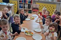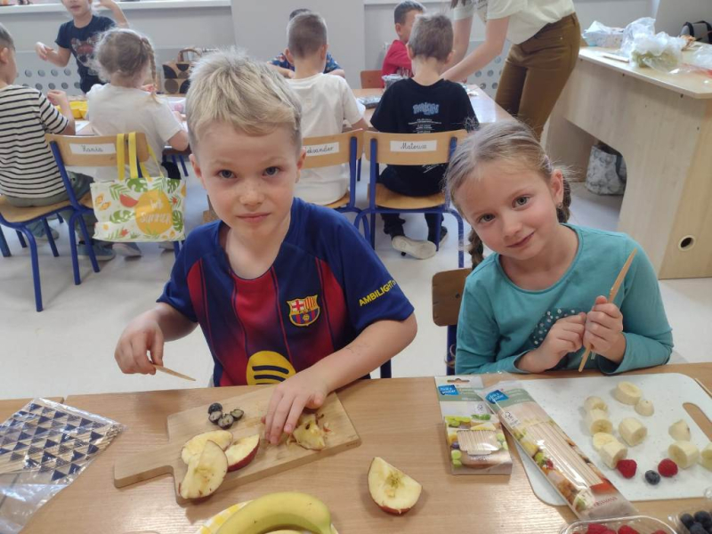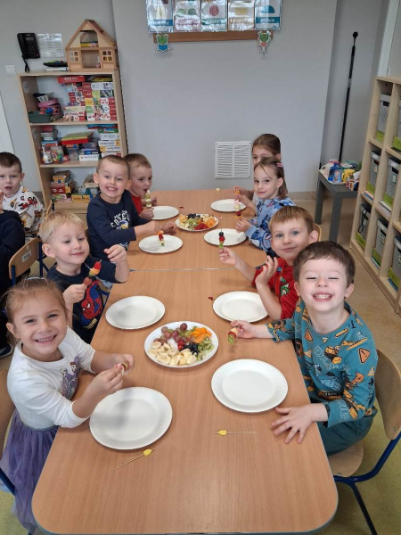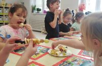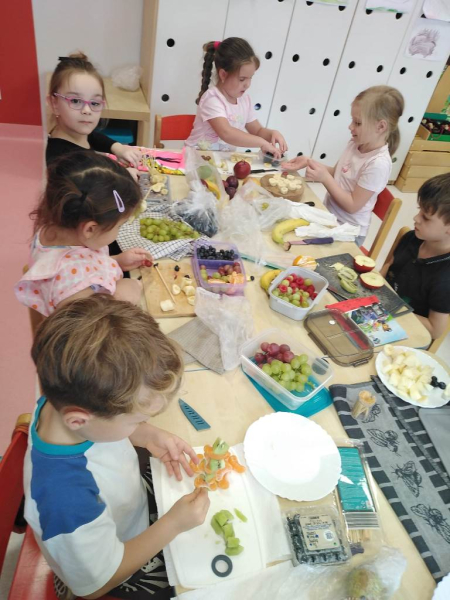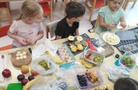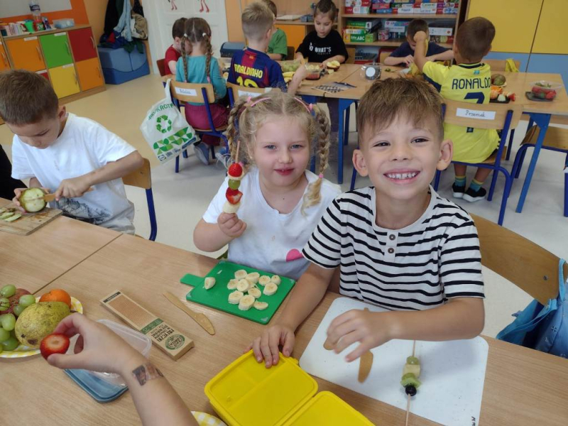 Kolejnym zadaniem realizowanym na łamach ww. projektu było zagadnienie pt: "Co jest zdrowe i dlaczego jest tak ważne?". Dzieci z grup "Jeżyki", "Mrówki" i "Żabki" przygotowały samodzielnie szaszłyki owocowe, a następnie przyszedł czas na ich degustację.