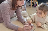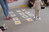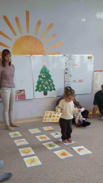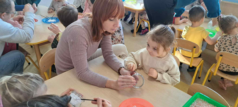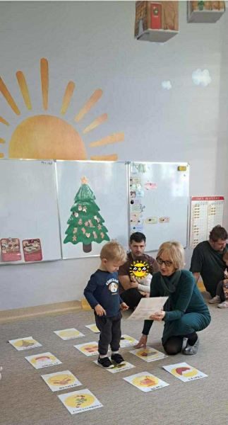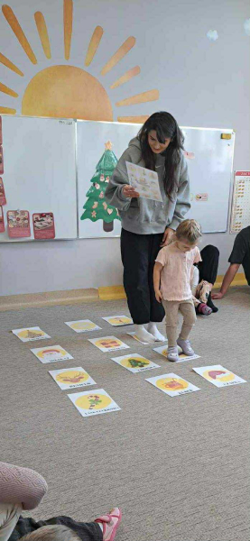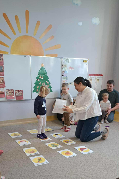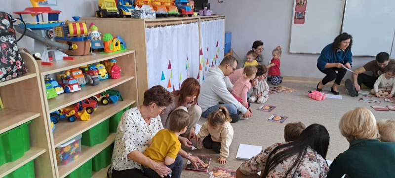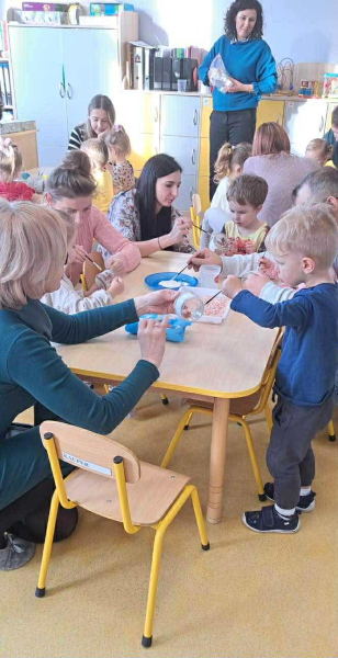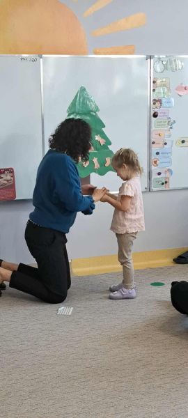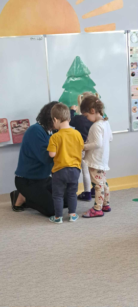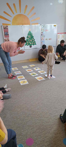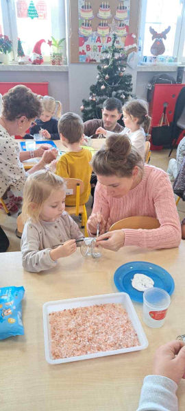 Celem zajęć było przybliżenie dzieciom tradycji świątecznych oraz wspieranie ich rozwoju poprzez różnorodne aktywności. Dzieci układały czteroelementowe puzzle przedstawiające elementy związane z wieczerzą wigilijną, rozwijając spostrzegawczość i logiczne myślenie. Wspólne śpiewanie piosenki o Mikołaju z pokazywaniem sprzyjało integracji dzieci i rodziców oraz rozwijaniu koordynacji ruchowej. Dzieci wysłuchały informacji dotyczących kształtów pierników, ćwicząc koncentrację i uważne słuchanie, a następnie udekorowały wspólną choinkę, ucząc się współpracy. Świąteczne rozkodowywanie drogi według mapy wspierało orientację przestrzenną i myślenie przyczynowo-skutkowe. Na zakończenie dzieci wykonały świąteczne świeczniki, rozwijając sprawność manualną, kreatywność oraz poczucie estetyki.
