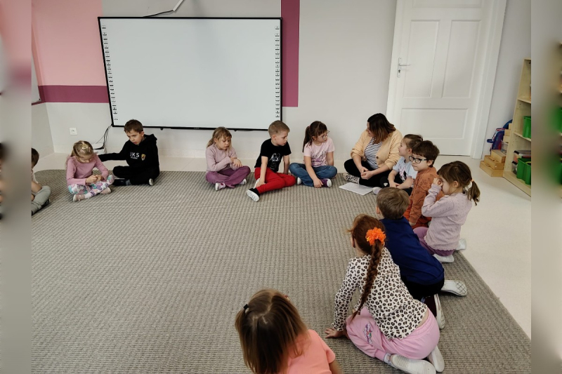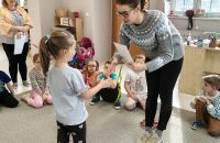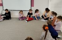 Szczególnym wydarzeniem była wizyta mamy Antosi – Pani Patrycji, która opowiedziała dzieciom o swojej pracy, przybliżając im, na czym polega praca kadrowej. Przygotowała także dla przedszkolaków ciekawe aktywności: łamigłówkę w formie labiryntu, kolorowanki oraz słodką niespodziankę, która sprawiła dzieciom wiele radości.