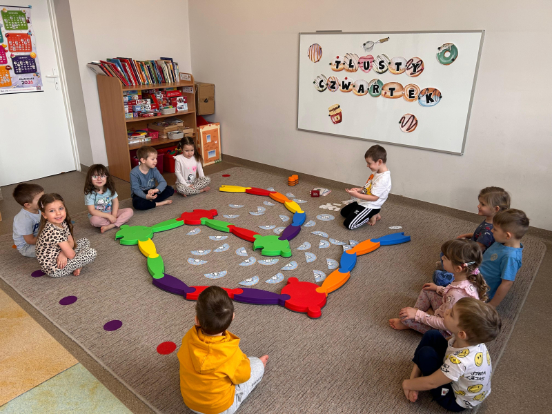 Miniony tydzień obfitował w wiele ciekawych wydarzeń. Dzieci wzięły udział w spotkaniu z policjantami, podczas którego rozmawiały o zasadach bezpieczeństwa. Obchodziliśmy również Dzień Pączka oraz Walentynki, które upłynęły w miłej i serdecznej atmosferze. Z okazji Walentynek, w ramach projektu „Podaj dalej dobro”, dzieci kolorowały serduszka z miłymi słowami, które następnie rozdawano innym, ucząc się okazywania życzliwości i empatii. Odwiedziliśmy także Centrum Kultury Karolinka podczas Radzionkowskiego Dnia Tańca, gdzie dzieci miały okazję obejrzeć występy różnych grup tanecznych. Każdego dnia wiele się działo, a wszystkie zajęcia dostarczyły dzieciom nowych doświadczeń i pozytywnych wrażeń.
