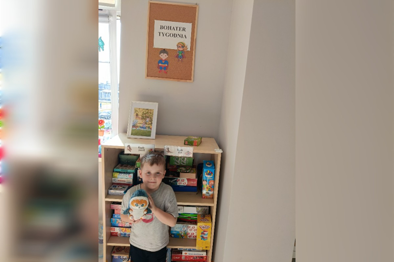 Kuba z dumą zaprezentował dzieciom swój kącik bohatera, do którego przyniósł ulubionego pluszaka oraz grę. Chętnie opowiadał o swoich skarbach i z radością dzielił się nimi z kolegami i koleżankami podczas wspólnej zabawy.