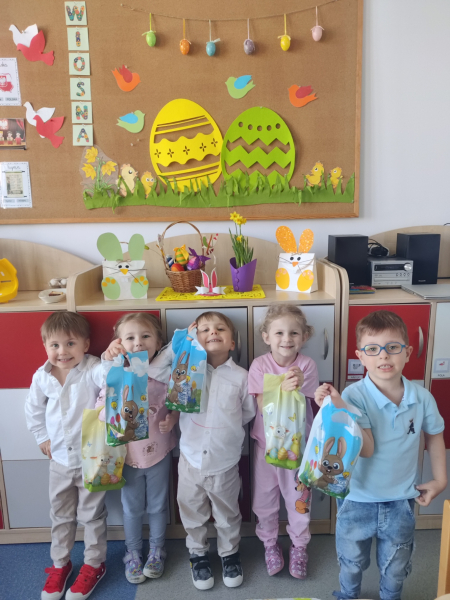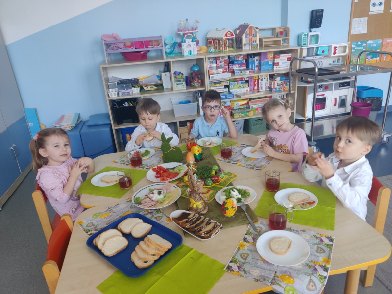 W dniu Wielkanocnego Śniadania w przedszkolu, Myszki przy wspólnym stole złożyły sobie życzenia oraz mogły skosztować samodzielnie wysianej rzeżuchy. W tym dniu wszystko związane było ze zbliżającymi się świętami - zajęcia, zabawa, a trakże poszukiwania Zajączka, które zakończyły się upominkiem dla każdego Przedszkolaka.